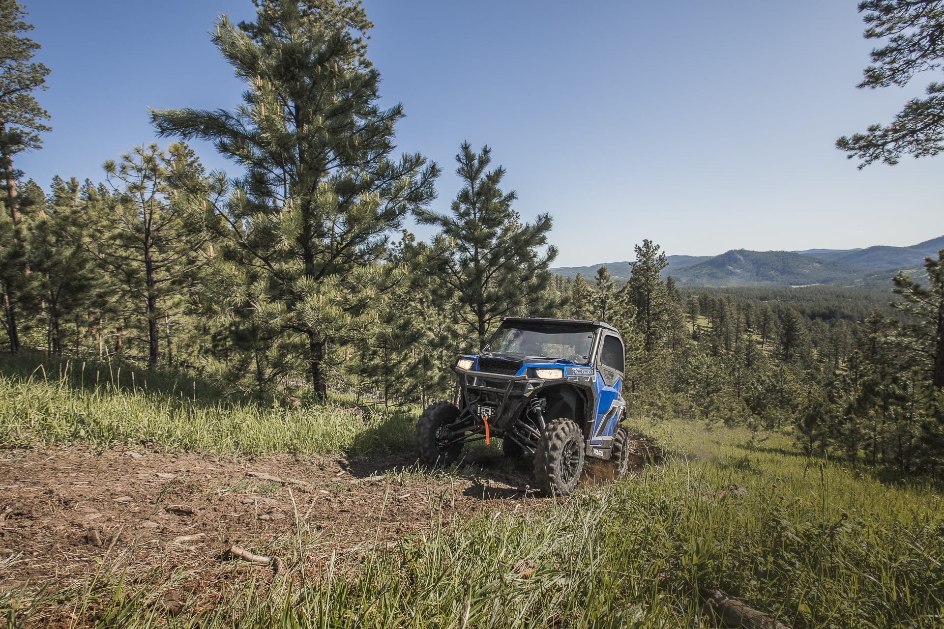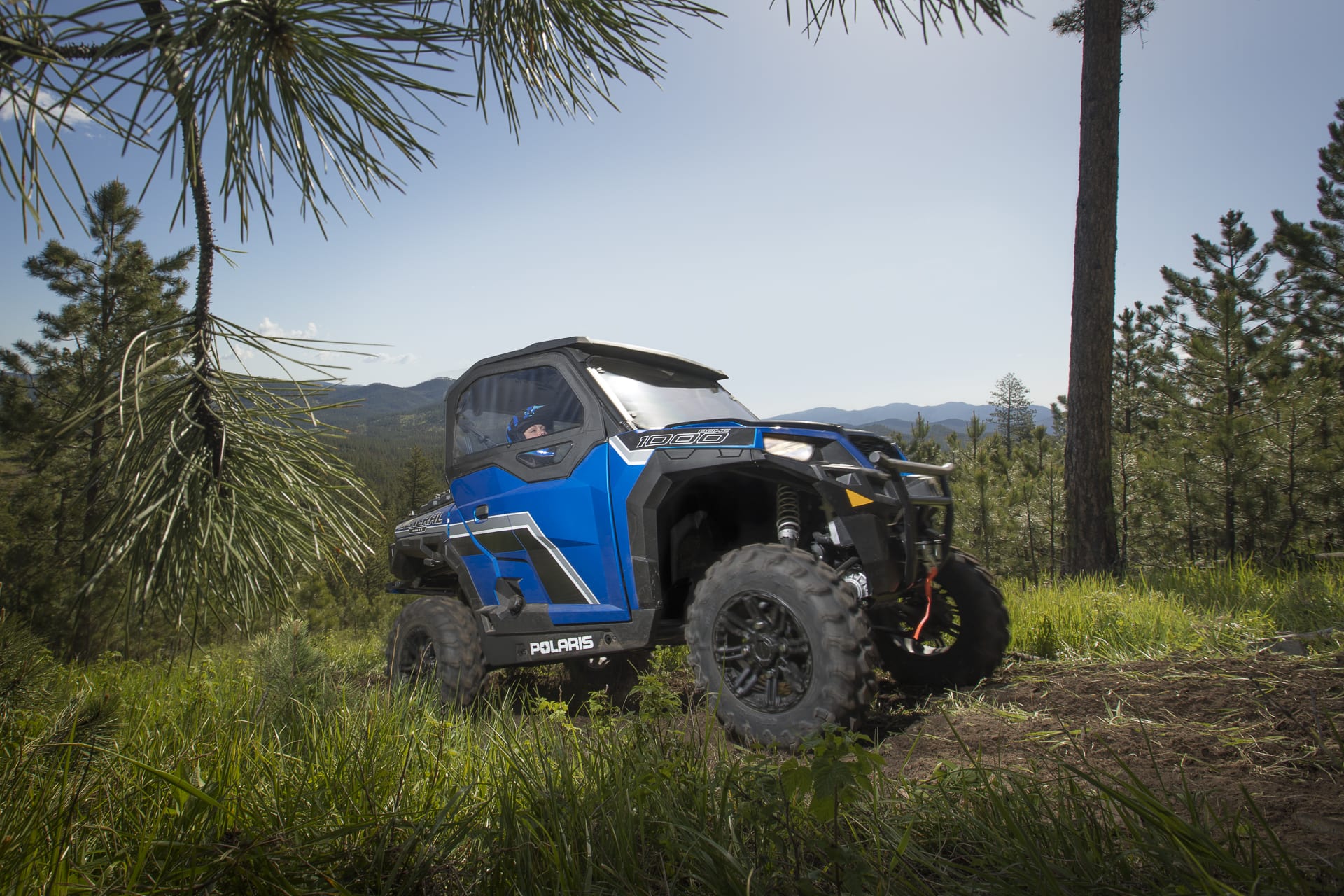 GENERAL 1000 EPS Premium: comprend une peinture métallique de style automobile disponible en bleu Radar, un pare-chocs avant sport à profil abaissé équipé d’un treuil Polaris HD de 4500 lb. (2041 kg) et des roues en aluminium moulé Matte Black de 14 pouces (35,56 cm) associées à pneus de 27 pouces (68,58 cm) Maxxis® Coronado.