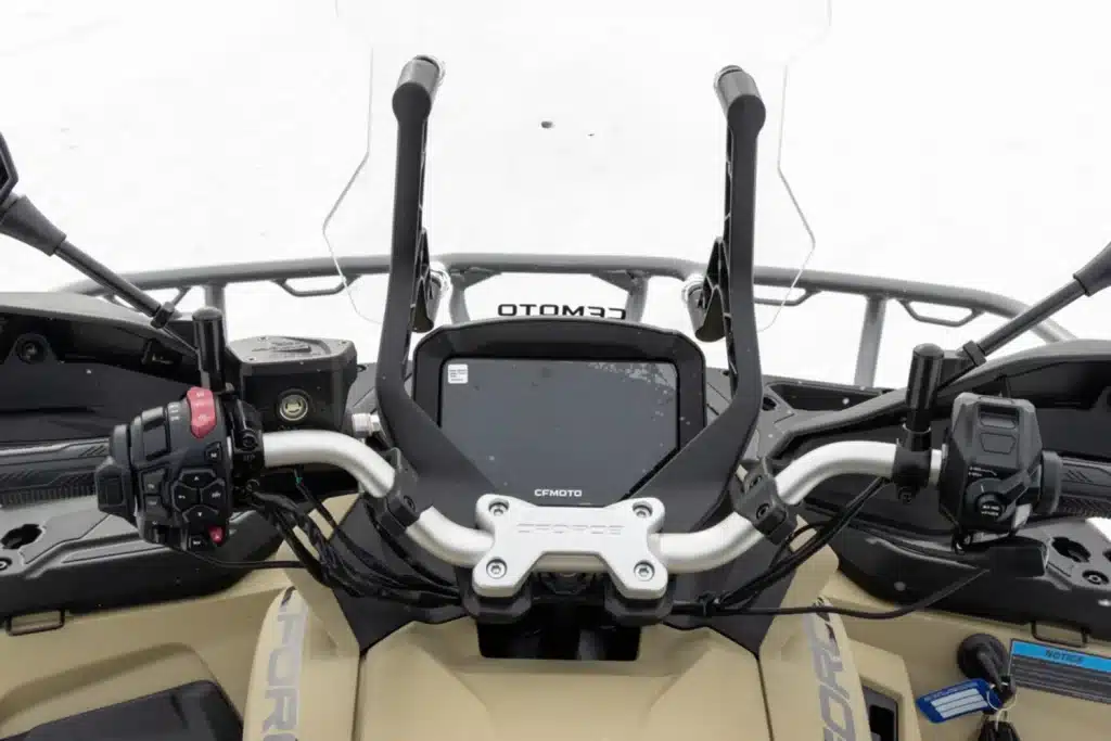 Lors de l’essai du CFMOTO CFORCE 1000 2025, nous constatons que l’ergonomie est soigneusement conçue, offrant une posture naturelle. Un siège vaste, soigneusement rembourré et même chauffant, assure un confort très appréciable. Le guidon est idéalement réglé pour une conduite à la fois vive et relaxante. Les commandes et poignées sont disposées de manière accessible, grâce à une disposition intuitive.