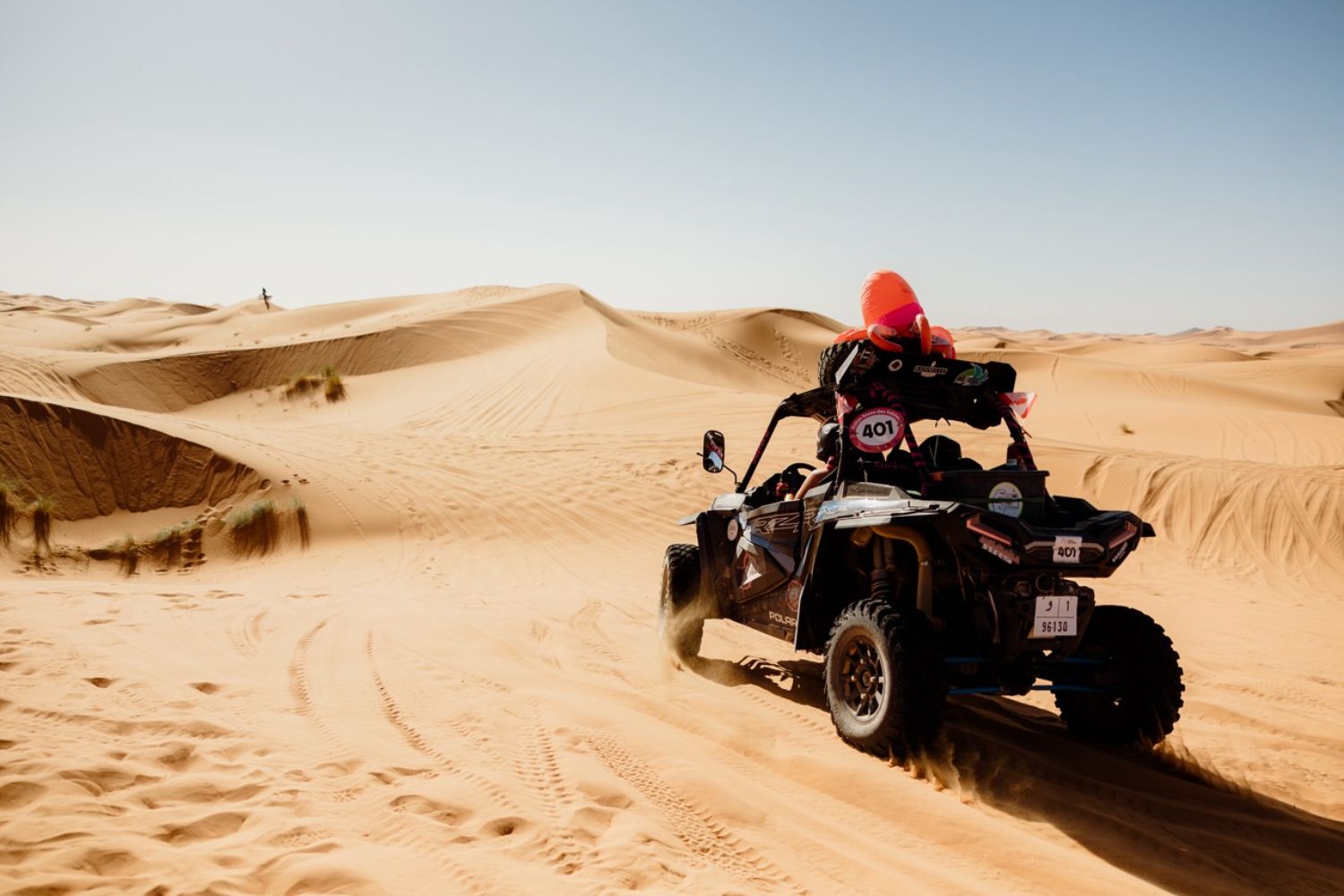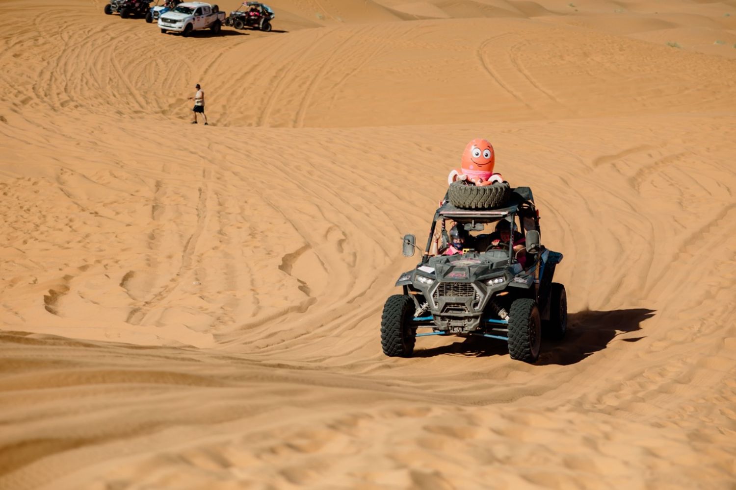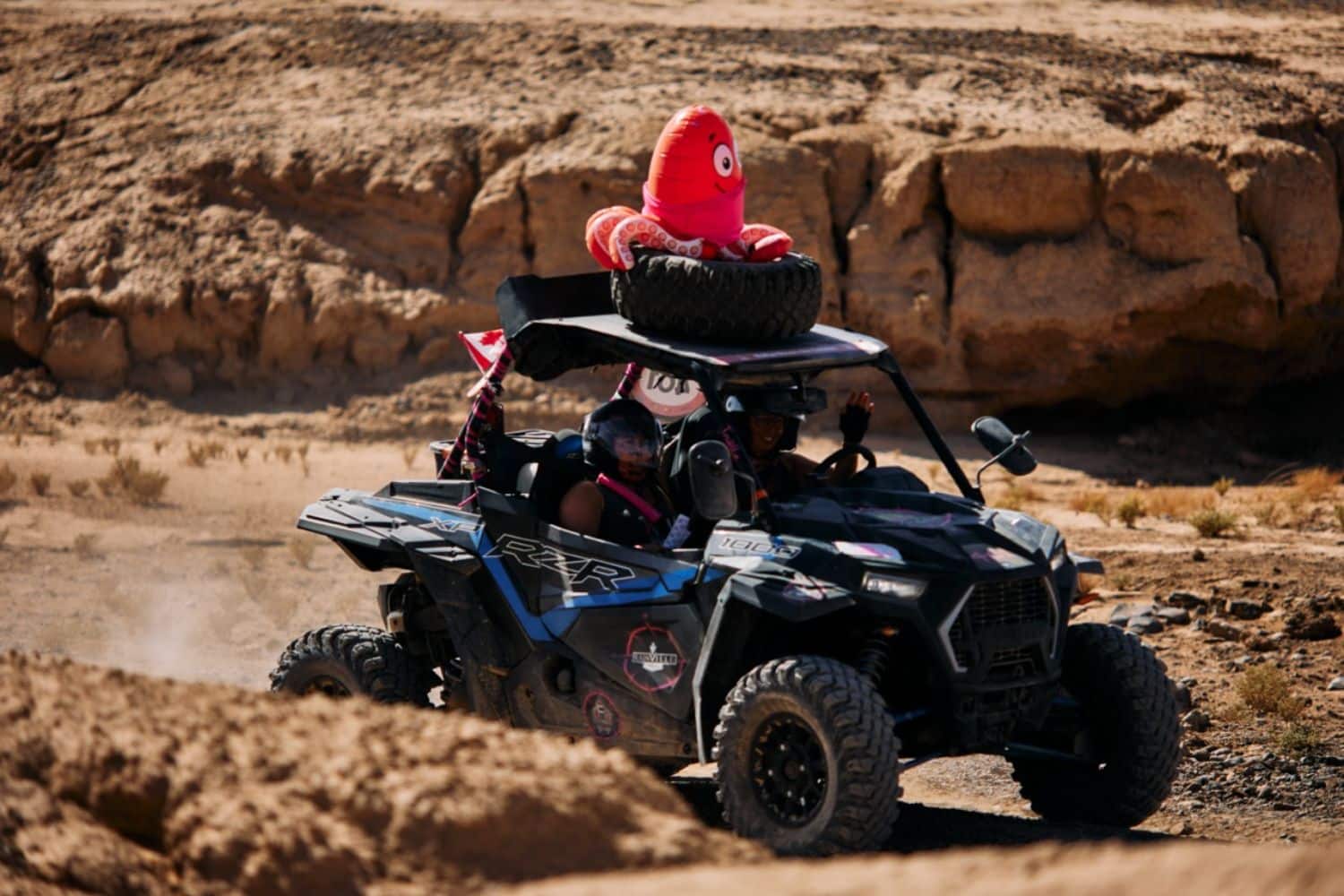 Octo est devenu le troisième équipier de l’équipe 401, les Twisted Painters. La belle pieuvre rose qu’il arborait sur le pneu de secours nous a valu le surnom de Pulpi par l’organisation ! Durant les deux premiers jours, nous avons eu le temps de finaliser nos derniers préparatifs pour le rallye : la personnalisation de notre véhicule, la livraison des dons aux organismes sur place, la rencontre précieuse avec les femmes et les enfants du désert, ainsi qu’une cérémonie touchante et significative de soutien au cancer du sein, qui s’est déroulée dans les dunes de sable avec plus de 250 femmes touchées de près ou de loin par ce fléau sans frontières. Des moments extrêmement précieux qui resteront gravés à jamais dans nos cœurs.
