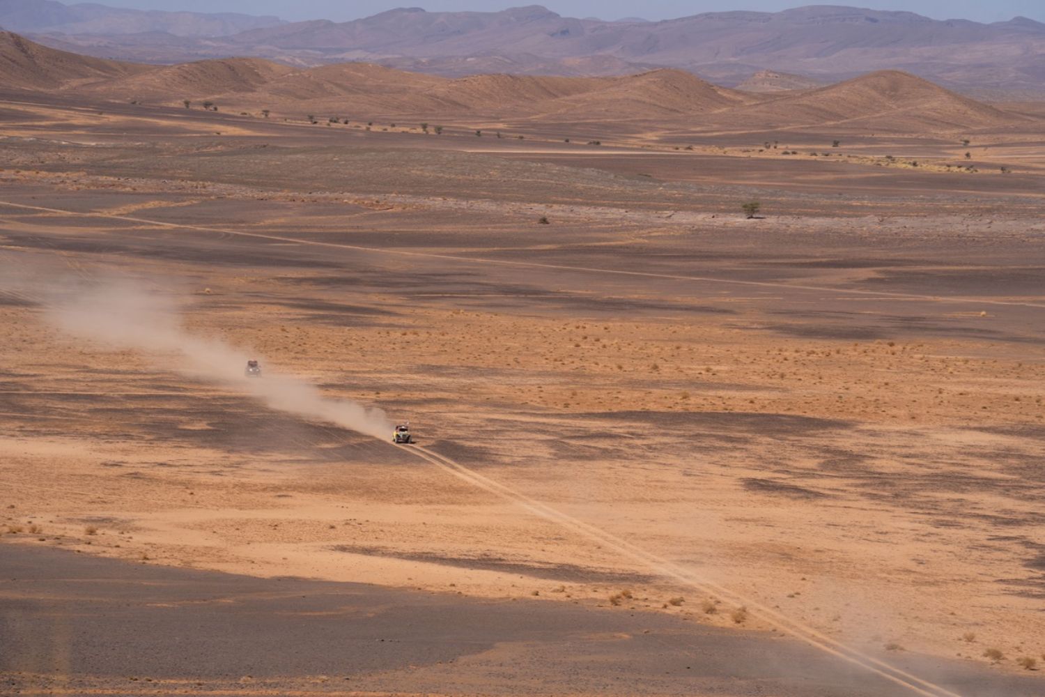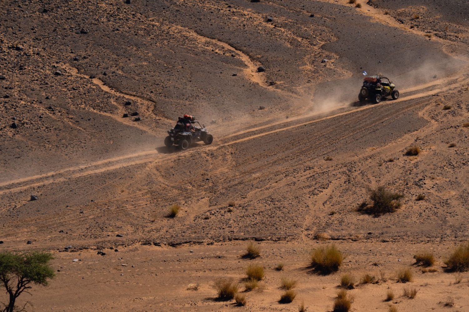 Le 19 octobre au matin, sous l’arche rose, face au désert, Stéphanie a appuyé sur l’accélérateur pendant que je la guidais, en apprenant encore comment lire le roadbook qui m’avait été remis la veille. Nos premières traces de pneus se sont dessinées sur le sol aride du désert, tantôt sablonneux, tantôt rocailleux, mystérieux, infini, grandiose et surprenant. Nous avons traversé des paysages lunaires, des zones inhabitées, des villages berbères, de petites et grandes dunes, des ruines dans des endroits quasi inaccessibles, ainsi qu’une multitude de rivières et lacs asséchés. Ces derniers nous rappelaient la fragilité de notre planète, qui se réchauffe sans cesse. Ici, l’eau est une denrée rare, d’une importance capitale, une véritable question de survie. Le trajet se déroulait bien : malgré mes insécurités liées à la lecture complexe du roadbook, Stéphanie, pour sa part, se sentait à l’aise derrière le volant, ce qui nous confirmait le bon choix de nos rôles respectifs.