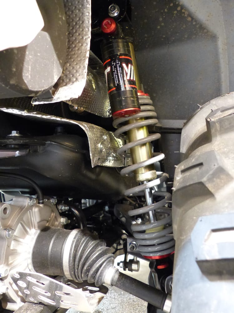 Lever les roues du quad à l’aide d’un vérin. Prenez les roues bien en mains et brasser de haut en bas et de gauche à droite. Rechercher un jeu. Ce dernier peut parvenir des biellettes de direction, des rotules de suspension, du roulement de roue ou bien des coussinets de bras de suspension. Un petit jeu des coussinets peut être acceptable mais le reste se doit d’être bien fixe. Ne négliger pas l’état de vos ressorts de suspension et amortisseurs. Les ressorts peuvent se casser, habituellement aux extrémités. Les amortisseurs défectueux vont laisser des traces d’huile le long de la tige. Ces éléments influent énormément sur la stabilité du quad.
